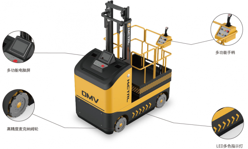 OMV揀選車顛覆傳統揀選車概念。零回轉半徑,側移,全方位無死角,任意漂移,窄巷道輕松、智能穿梭。可選配遙控器。