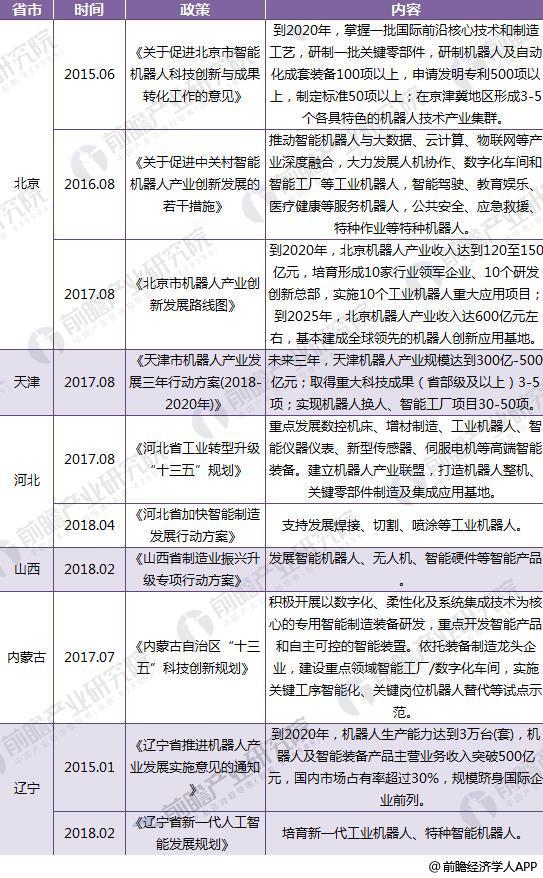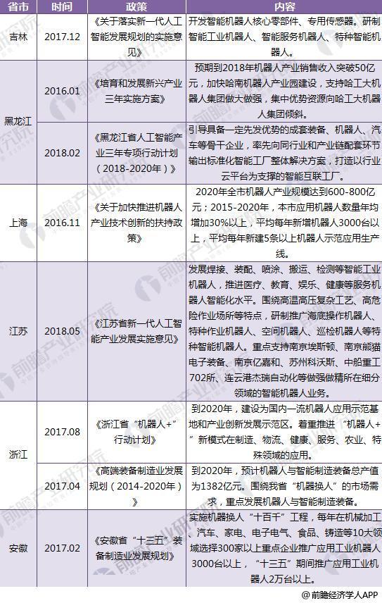 國家政策先行,地方政策迅速跟進:2016年以來,我國各省市圍繞“機器人”發布了多項產業促進政策,尤其是北京、天津、遼寧、上海、浙江等10個省市出臺了機器人相關的產業規劃。
