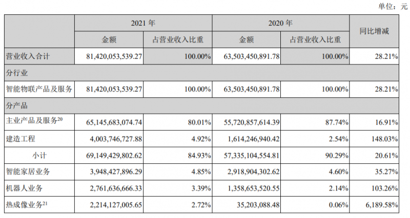 2015年以來,海康威視鼓勵(lì)內(nèi)部員工創(chuàng)新創(chuàng)業(yè),建立內(nèi)部創(chuàng)新跟投制度,先后成立了8個(gè)創(chuàng)新業(yè)務(wù)。2021年,有5個(gè)創(chuàng)新業(yè)務(wù)的收入超過10億、凈利潤(rùn)為正。其中,公司智能家居業(yè)務(wù)營(yíng)收達(dá)到了39億元,同比增長(zhǎng)35.27%、機(jī)器人業(yè)務(wù)營(yíng)收達(dá)到了27億元,同比增長(zhǎng)103%、熱成像業(yè)務(wù)營(yíng)收達(dá)到22億元、同比增長(zhǎng)6189.58%。年報(bào)顯示,螢石網(wǎng)絡(luò)已經(jīng)遞交IPO申請(qǐng);海康機(jī)器人擬分拆上市,相關(guān)籌備工作正在推進(jìn)中。