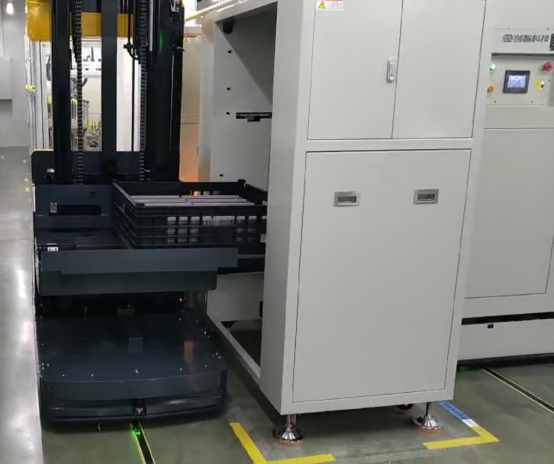 其中,消費類電池靜置庫,因負載輕、出入庫效率相對較低,創(chuàng)智自主研發(fā)側(cè)向叉車AGV,集柔性物流AGV與堆垛機省空間之優(yōu)勢,巷道寬度窄(料框?qū)挾?150mm),實現(xiàn)倉庫間以及倉庫到生產(chǎn)設備的跨車間、跨工序的對接和搬運,減少二次周轉(zhuǎn)和裝載時間。