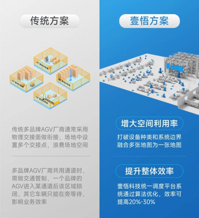 壹悟科技星羅自動化工廠解決方案,可打破設備種類與品牌的邊界,將原本封閉運行的硬件區域融合互通,把分裂的“多張地圖”合并為一張地圖,實現多種設備的信息互通,真正實現效率與空間利用率的雙向提升。