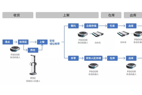 由RS5貨箱機器人、P40貨到人機器人、四向穿梭車及AI算法和智能倉庫管理系統(WMS)構成。