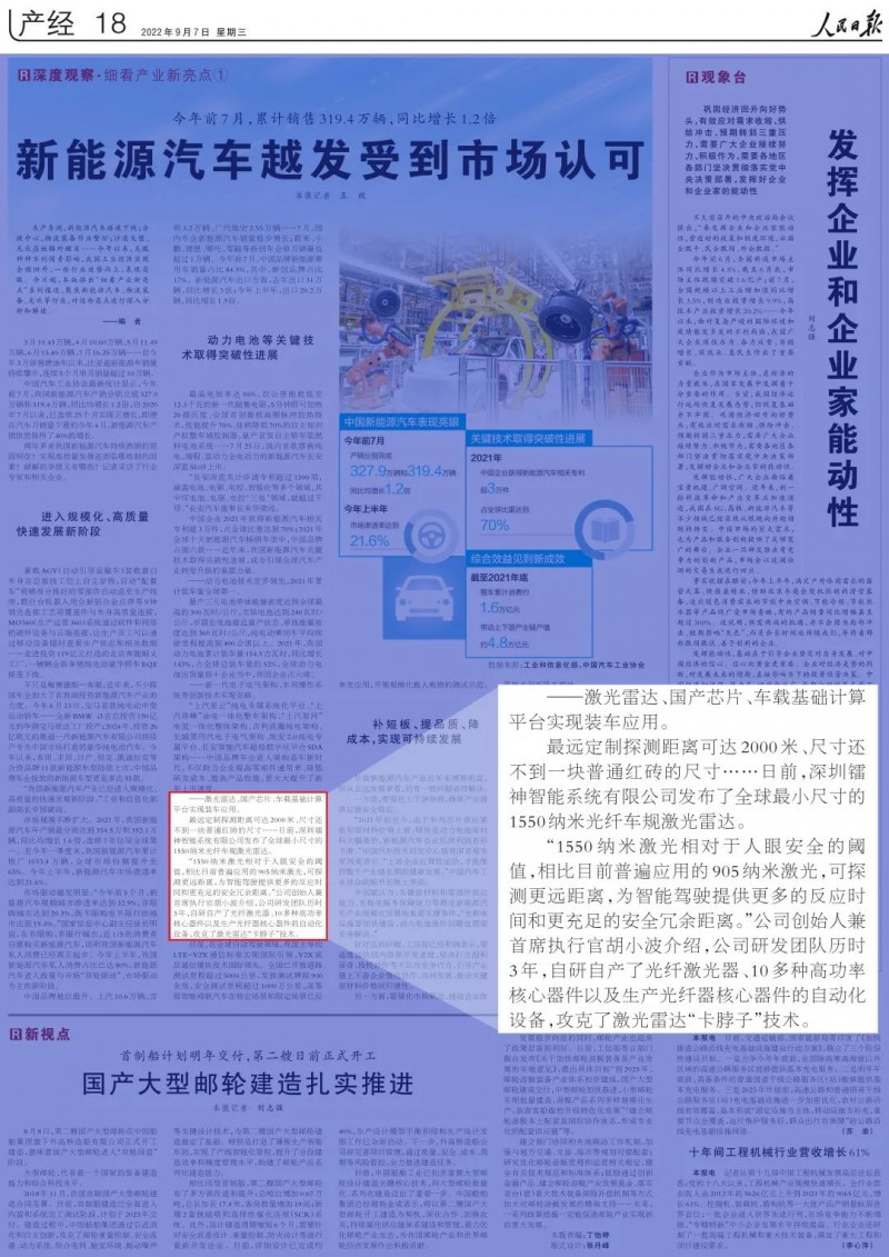 2022年9月7日,人民日報刊登了一篇名為《新能源汽車越發(fā)受到市場認可》的文章,其中介紹了鐳神智能創(chuàng)始人胡小波帶領團隊攻克了我國被“卡脖子”的激光雷達技術問題。