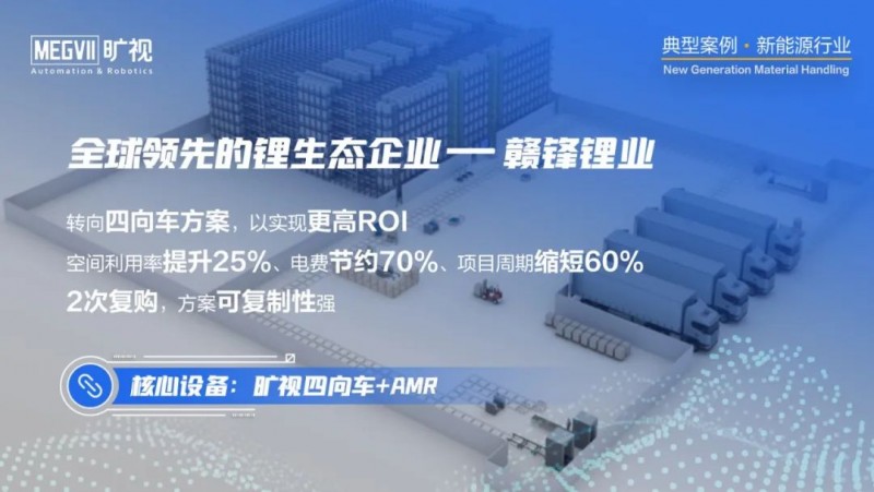 智慧物流方案在新能源行業(yè)的應(yīng)用主要有產(chǎn)線物流和倉儲(chǔ)物流兩大塊。曠視能為新能源企業(yè)提供柔性智能的3A智慧物流解決方案(AS/RS+AMR+AI),包括智能立庫系統(tǒng)、機(jī)器人搬運(yùn)系統(tǒng)和智慧物流軟件平臺(tái),滿足新能源企業(yè)對(duì)產(chǎn)線物流和倉儲(chǔ)物流的升級(jí)需求。