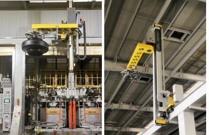 UQI優(yōu)奇EMS自行小車的軌道布置在高空中,避開(kāi)了擁擠的地面空間,以機(jī)械手從各個(gè)成型機(jī)收取胎胚。其最高運(yùn)行速度高達(dá)200米/分鐘,可充分滿足大面積廠房的快速輸送需求。