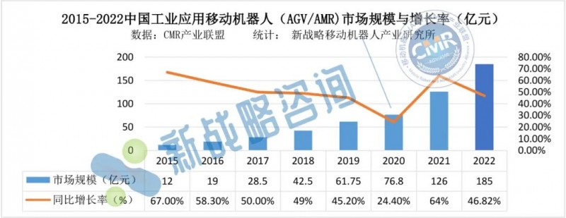 根據CMR產業聯盟數據,新戰略移動機器人產業研究所統計,2022年度,中國市場企業整體銷售工業應用移動機器人(AGV/AMR)93000臺,較2021年增長29.17%,市場銷售額達到185億元,同比增長46.83%。