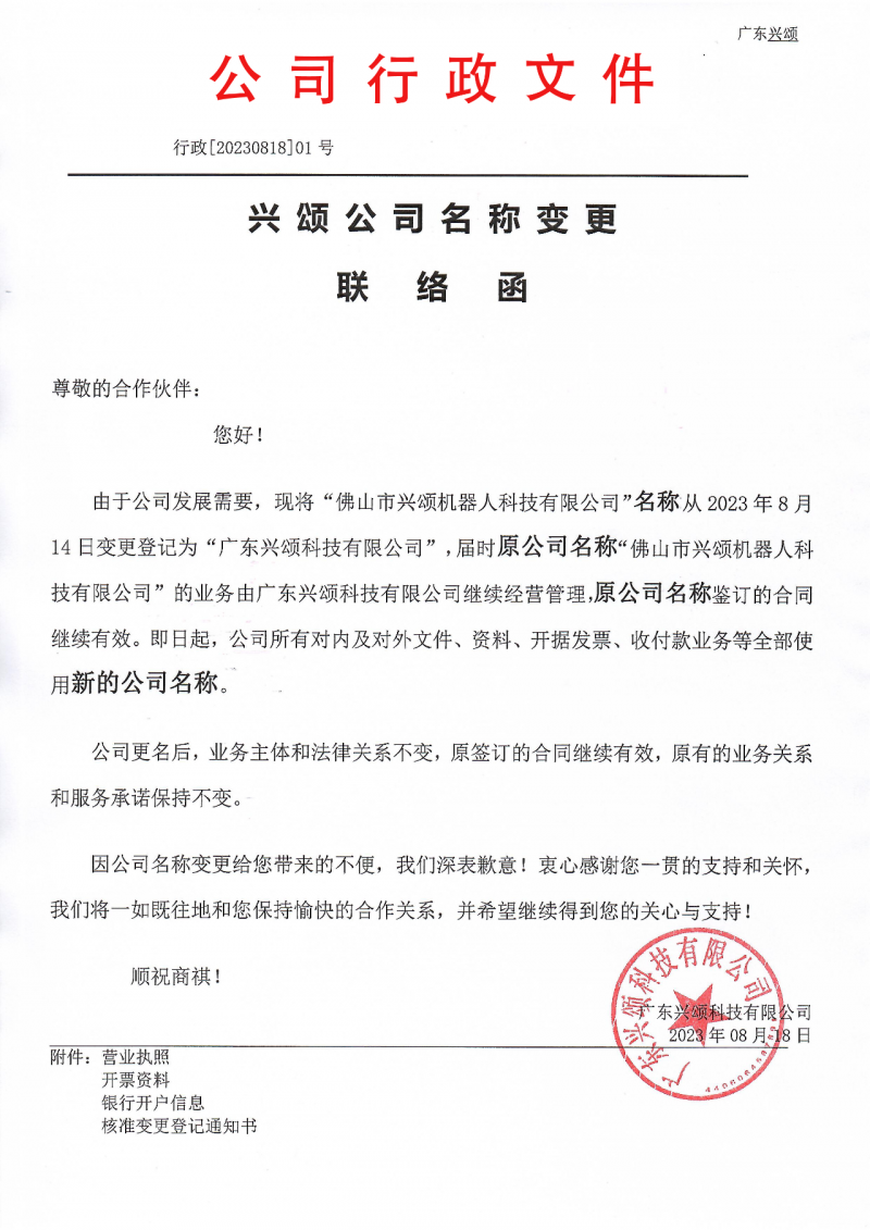 因企業(yè)發(fā)展需要,2023年8月14日我司名稱由“佛山市興頌機(jī)器人科技有限公司”變更為“廣東興頌科技有限公司”