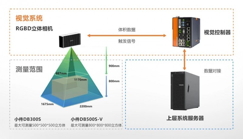 DB300S最大可測量500mm*500mm*500mm立方體;DB500S-V最大可測量800mm*800mm*800mm立方體,規則物體測量精度:±5mm;不規則物體測量精度:±10mm,可有效應對傳統快遞物流和跨境電商兩大應用場景的小件體積測量需求。