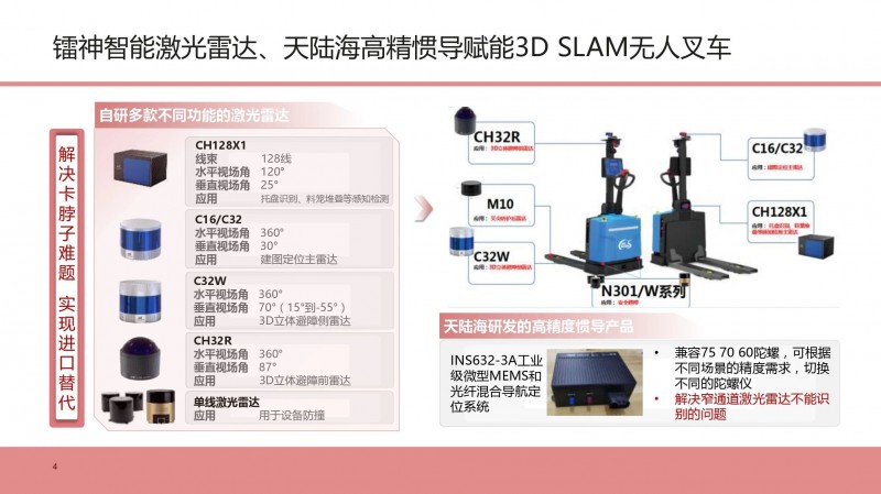 在論壇分享會(huì)上介紹了無(wú)人叉車(chē)配置的技術(shù)領(lǐng)先全球的鐳神智能激光雷達(dá)系列產(chǎn)品,解決了卡脖子難題,實(shí)現(xiàn)國(guó)產(chǎn)化自主可控,每臺(tái)無(wú)人叉車(chē)周身配置7-8顆激光雷達(dá),提供豐富穩(wěn)定的全方位立體感知信息,做到更安全、更穩(wěn)定、更可靠。