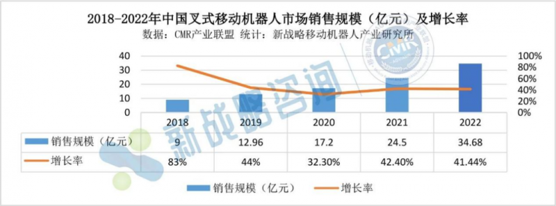 圖表:2018-2022年中國叉式移動機器人市場銷售規模(億元)及增長率