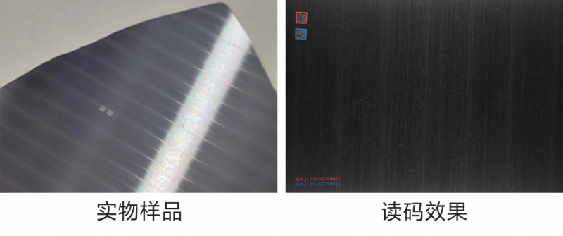需求:光伏硅片生產的質量追溯,硅片上激光鐳雕的極小碼讀取,碼大小0.6*0.6mm,通過刻印兩個二維碼增加識別率,安裝空間180mm以內。