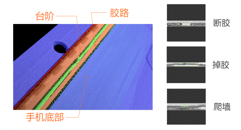 檢測手機(jī)中框點膠質(zhì)量,包括膠寬、膠高、斷膠及塌膠、爬墻和掉膠