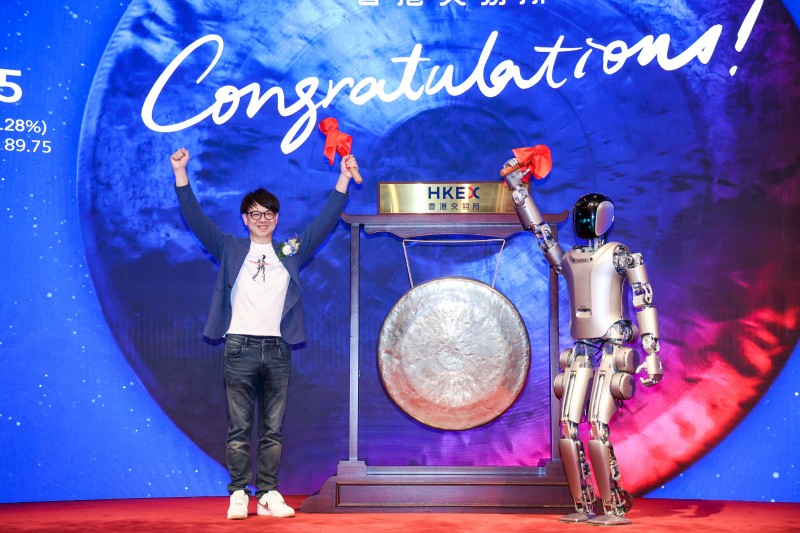 圖片3:Walker S與優(yōu)必選董事會(huì)主席、執(zhí)行董事兼行政總裁周劍一起敲鑼