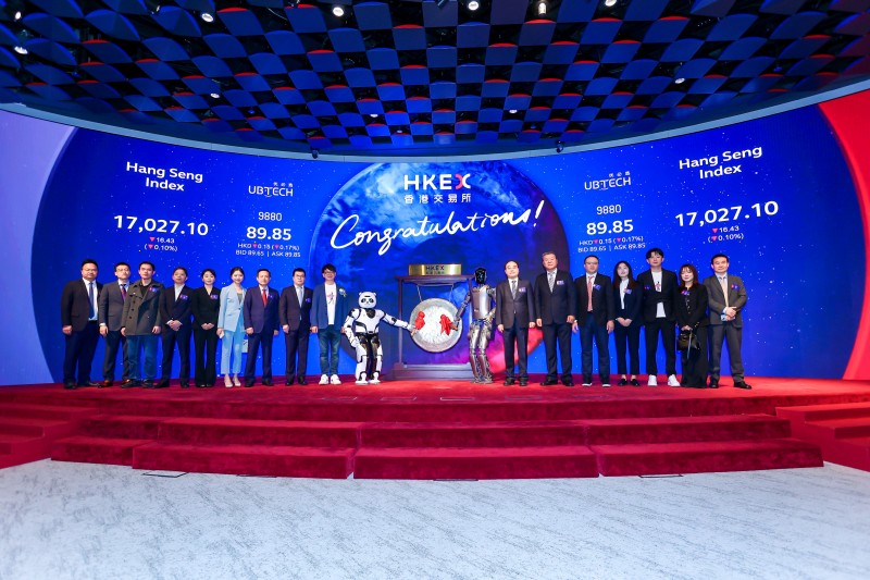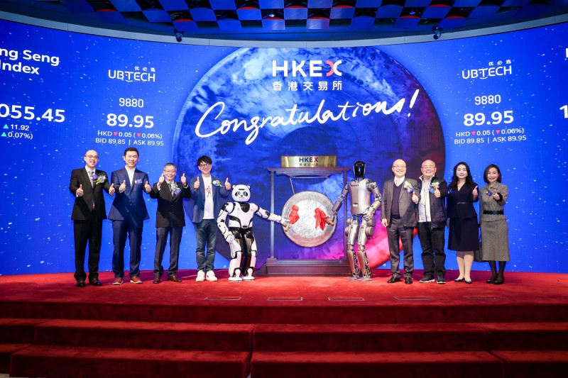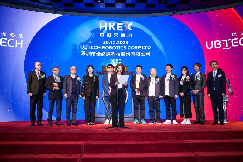 圖片1:從左至右依次為:香港交易所聯(lián)席營(yíng)運(yùn)總監(jiān)陳翊庭,香港聯(lián)交所上市委員會(huì)主席Renu BHATIA,優(yōu)必選董事會(huì)主席、執(zhí)行董事兼行政總裁周劍,香港創(chuàng)新科技及工業(yè)局局長(zhǎng)孫東,香港引進(jìn)重點(diǎn)企業(yè)辦公室執(zhí)行總裁吳國(guó)才及機(jī)器人合影