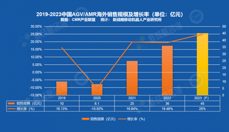 圖表:2019-2023中國AGV/AMR海外銷售規(guī)模及增長(zhǎng)率