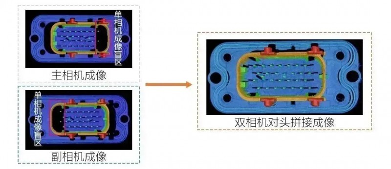 方案優(yōu)勢:通過兩臺DP2120并排拼接,在保證精度的基礎(chǔ)上增大視野范圍,單次掃描即可測量平整度,提高了檢測節(jié)拍
