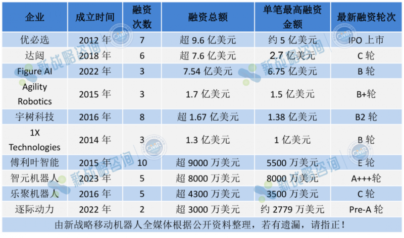 Agility Robotics、宇樹科技、1X Technologies、傅利葉智能、智元機器人、樂聚機器人和逐際動力等企業分列其后。其中,Agility Robotics、宇樹科技、1X Technologies總融資金額均已破1億美元,傅利葉智能也逐漸逼近這一門檻。