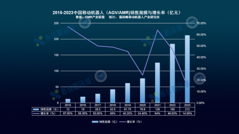 圖表:2015-2023中國工業(yè)應(yīng)用移動(dòng)機(jī)器人(AGV/AMR)銷售規(guī)模與增長率