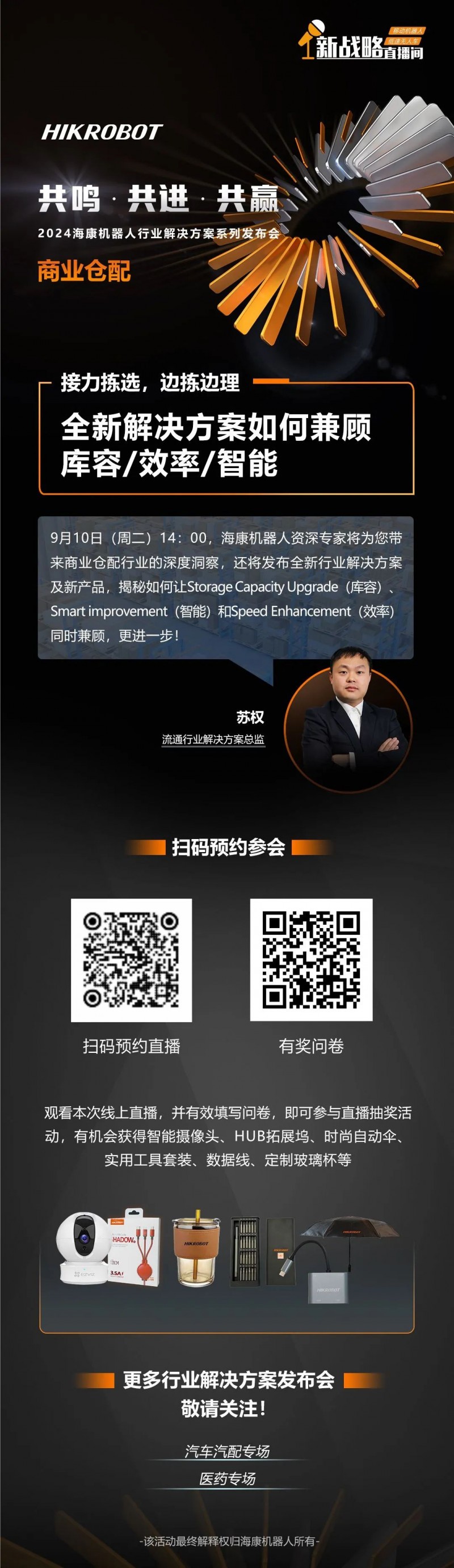 9月10日(周二)14:00,海康機(jī)器人資深專家將帶來商業(yè)倉(cāng)配行業(yè)的深度洞察與技術(shù)分享,同時(shí)發(fā)布全新行業(yè)解決方案和新產(chǎn)品,揭秘新方案如何做到任務(wù)解耦,接力揀選,同時(shí)突破揀、理貨無法并行的挑戰(zhàn),做到邊揀邊理,讓