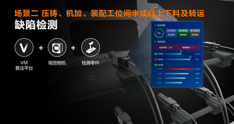 海康機(jī)器人利用工業(yè)相機(jī),并通過VM算法平臺,實(shí)現(xiàn)高效缺陷檢出。對于壓鑄件,能夠檢測出凸起、缺料、多料、裂紋和碰劃傷等缺陷;在機(jī)加和裝配環(huán)節(jié),檢測內(nèi)容包括孔洞有無、通孔是否打通、螺紋孔質(zhì)量、預(yù)鑄孔加工面和倒角等。