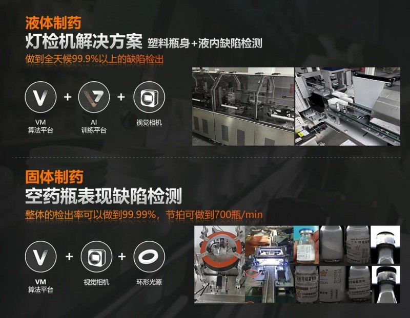 質量安全永遠是制藥領域的第一要求。在液體及固體制藥領域,通過高分辨率面陣相機與深度學習AI算法的結合,海康機器人提供的機器視覺解決方案能夠精準檢測瓶身外觀缺陷及液內異物,大幅提升檢測準確率與效率,同時保障檢測人員的健康安全。