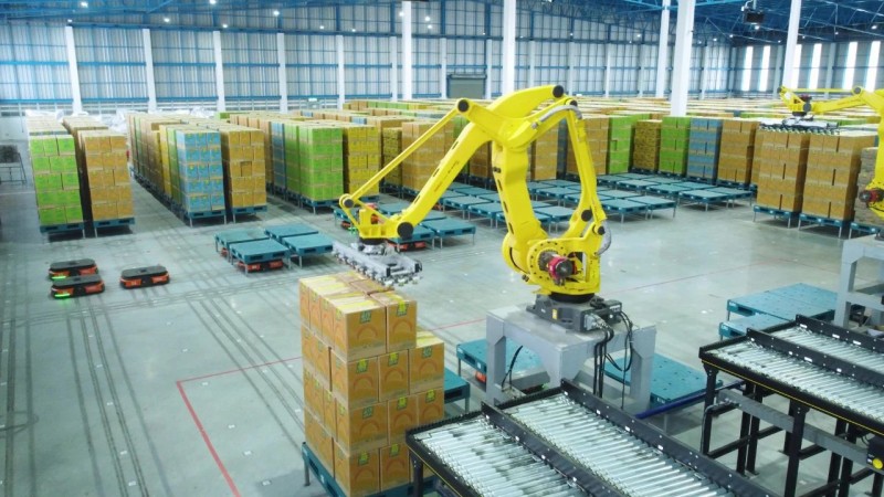 為了實現倉庫全流程自動化和24/7運營,EUROFOOD在Sa Kaeo和PRACHIN BURI兩家工廠部署了50臺海康機器人AMR。AMR系統與現有機械臂協同作業,實現從入庫、存儲、揀選到出庫的全流程自動化。