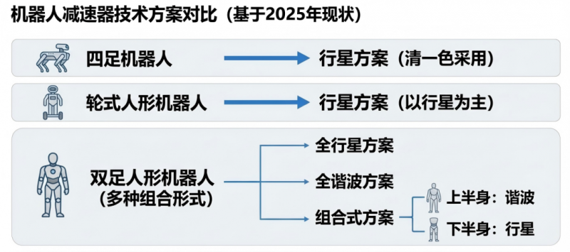 從實(shí)際出貨結(jié)構(gòu)來看,不同機(jī)器人形態(tài)對(duì)關(guān)節(jié)方案的選擇已經(jīng)出現(xiàn)分化。四足機(jī)器人幾乎清一色采用行星方案;輪式人形機(jī)器人同樣以行星為主;在雙足人形上,則存在多種組合形式——有的采用行星方案,有的采用諧波方案,有的在上半身使用諧波、下半身使用行星。相比之下,RV減速器由于傳動(dòng)效率偏低、發(fā)熱問題突出,目前并未發(fā)現(xiàn)在人形機(jī)器人上有成熟的方案。