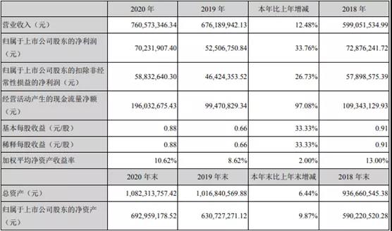 據(jù)寧波中大力德智能傳動(dòng)股份有限公司發(fā)布的2020年年度報(bào)告顯示,公司2020年度實(shí)現(xiàn)營(yíng)業(yè)收入 7.61億元,同比增長(zhǎng)12.48%;歸屬于上市公司股東的凈利潤(rùn)7023.19萬元,同比增長(zhǎng)33.76%,扣除非歸母凈利潤(rùn)為5883萬,同比增長(zhǎng)26.73%。