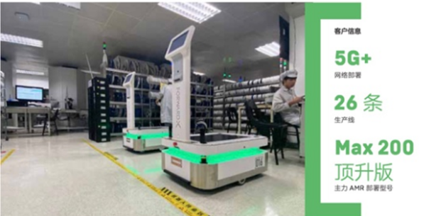 全球領(lǐng)先的某大型通信設(shè)備公司無線小基站智能工廠項目,迦智科技近百臺自然導航AMR,在5G技術(shù)低延時、高帶寬、高速率的傳輸特性加持下,實現(xiàn)了與用戶現(xiàn)場的MES、WMS以及第三方設(shè)備間的互聯(lián)互通,信息上傳下達,交互協(xié)同作業(yè)。