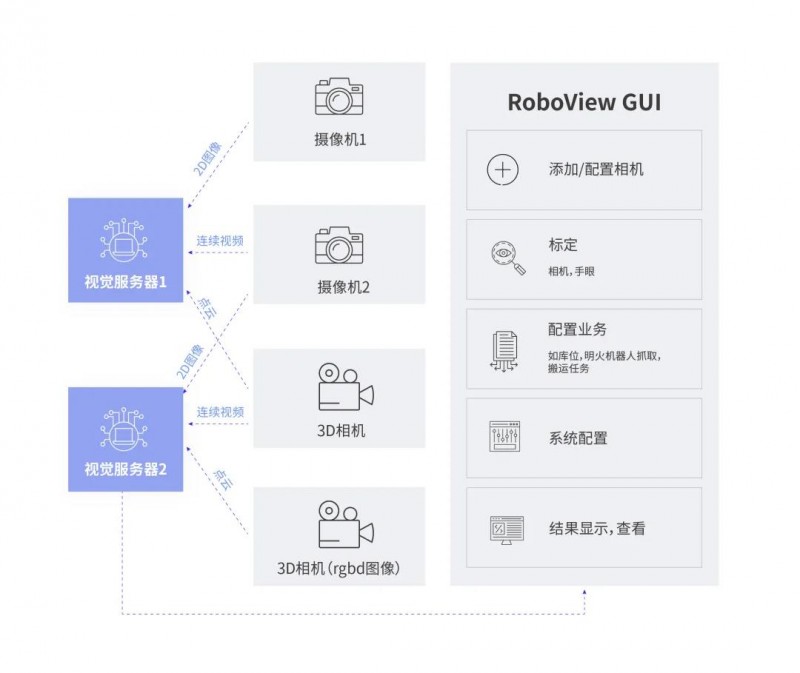 RoboView 視覺 AI 解決方案以先進的機器視覺算法為后臺(RoboView Server),以易于操作和直觀顯示的界面軟件 RoboView GUI 為前端,為客戶提供覆蓋生產、安全、管理等環節下的眾多應用的視覺 AI 解決方案。