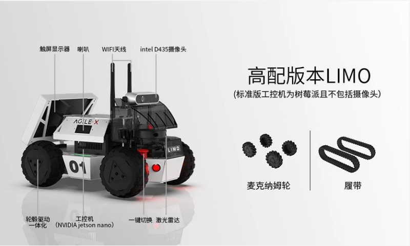 采用電機(jī)驅(qū)動一體化輪轂電機(jī)的配置也大大增加了車體平臺搭載空間,LIMO集成了包括激光雷達(dá)、深度相機(jī)、輪速計、觸屏顯示屏等超高性能傳感器。為便于用戶根據(jù)實(shí)際應(yīng)用需求選配,LIMO提供了標(biāo)準(zhǔn)版和高配版兩個版本,主要區(qū)別在于控制模塊和深度相機(jī)配置。標(biāo)準(zhǔn)版采用的樹莓派Raspberry Pi,而高配版則搭載的是具有4核CPU和4G內(nèi)存的NvidiaJetson nano開發(fā)板,同時高配版還搭載了英特爾深度相機(jī)D435, 可實(shí)現(xiàn)深度視覺V-SLAM功能,并能實(shí)現(xiàn)黑暗環(huán)境下的環(huán)境感知,有利于開發(fā)者學(xué)習(xí)地下管道等狹小黑暗空間的安全巡檢應(yīng)用開發(fā)等。