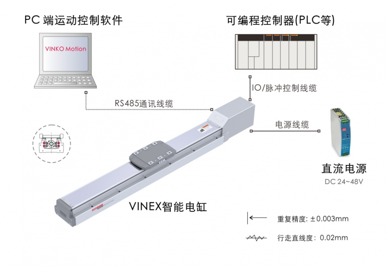 無(wú)需外置驅(qū)動(dòng)器:Vinex采用驅(qū)動(dòng)控制集成設(shè)計(jì),無(wú)需外置驅(qū)動(dòng)器,通過(guò)電源線和通訊線纜即可驅(qū)動(dòng)電缸。節(jié)省設(shè)備空間,大幅簡(jiǎn)化走線和布線的成本。