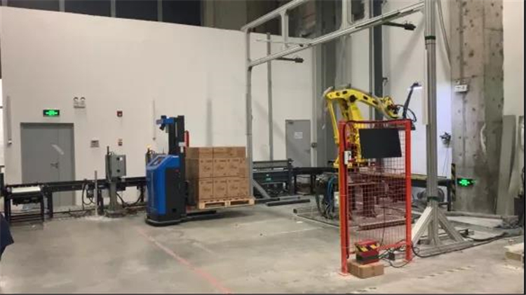 快遞行業具有貨物重量輕,時效性高的特性,聯核為客戶匹配1.6噸的堆垛型無人叉車,通過著重優化車輛搬運的平順性和工位上碼垛的準確性,車輛在接收到出庫任務時,自動從立體庫搬運貨物至機械臂,機械臂通過揀選指令,將貨物從托盤轉至輸送線,揀選任務完成后,無人叉車自動從機械臂工位將空托盤回收,實現機械臂、輸送線、立體庫和無人叉車的聯動效果,達到現場運營的預期。