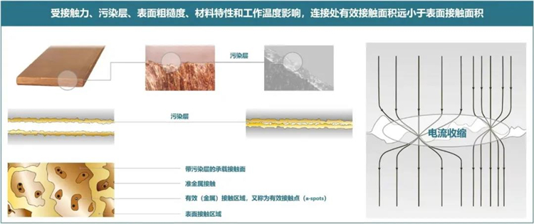 在所有接觸不良火災原因中,線路接頭處接觸電阻過大引起的火災居于第一位。因此接觸電阻大小直接影響著電連接質量,穩定的低接觸電阻可以確保電連接長期安全可靠。根據電接觸理論,金屬接觸表面在微觀條件下總是凹凸不平的,同時受污染層(灰層、油膜、金屬化合物)影響,電流通道集中在單個接觸點,有效接觸面積明顯小于表面接觸面積,看似面與面的連接,其實是點與點的連接,從而產生收縮電阻。同時污染層也會產生表面膜層電阻,最終導致接觸電阻增大。