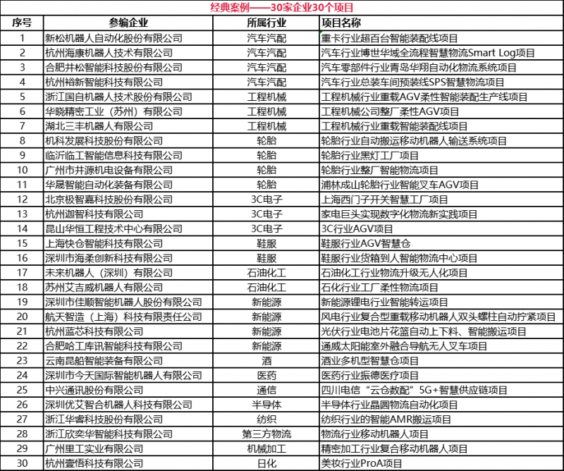 為了更好的宣導和展示從91年國產AGV落地應用以來在各行各業的經典案例,以及將案例與技術相結合,凸顯行業前瞻技術的論文集萃。中國移動機器人(AGV/AMR)產業聯盟與新戰略移動機器人產業研究所聯合出版了《中國工業應用移動機器人經典案例匯編及技術發展論文集(2021版)》。具體入選案例名錄如下: