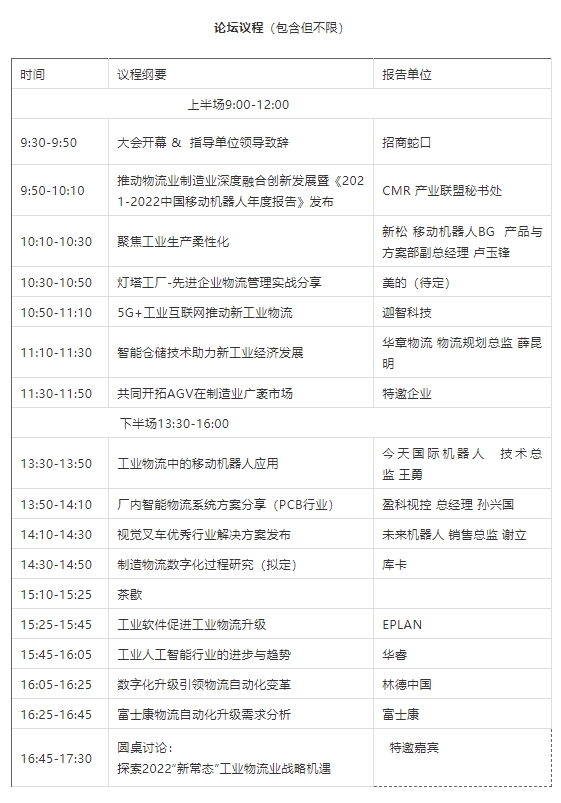 招商蛇口產(chǎn)業(yè)園區(qū)事業(yè)部ITES 深圳國際工業(yè)制造技術(shù)展覽會世界經(jīng)濟論壇大中華先進制造(燈塔工廠)深圳市服貿(mào)服務(wù)貿(mào)易協(xié)會上游硬件設(shè)備:貨物包裝、智能立體倉庫、AGV自動搬運機器人、AMR自主移動機器人、無人配送機器人、碼垛機器人、RFID自動識別設(shè)備、堆垛機、輸送機、分揀機、無人叉車、無人機、智能快遞柜等;中游軟件系統(tǒng):物流管理信息系統(tǒng)(LMIS)、智能倉庫管理系統(tǒng)(SWMS)、倉庫控制系統(tǒng)(WCS)、集成倉儲管理系統(tǒng)(IWMS)、制造執(zhí)行系統(tǒng)(MES)等;下游應(yīng)用行業(yè):醫(yī)藥、汽車、新能源、鋰電池、3C、電子、零售、電商、冷鏈等。其他:物流周邊設(shè)備及配件、自動化包裝設(shè)備及材料、運動控制技術(shù)及產(chǎn)品、氣動液壓執(zhí)行元件、齒輪傳動/減速機、軸承及傳動聯(lián)結(jié)件、產(chǎn)業(yè)園區(qū)等