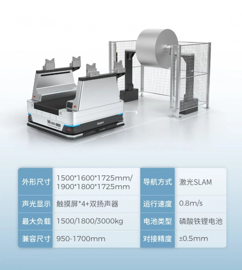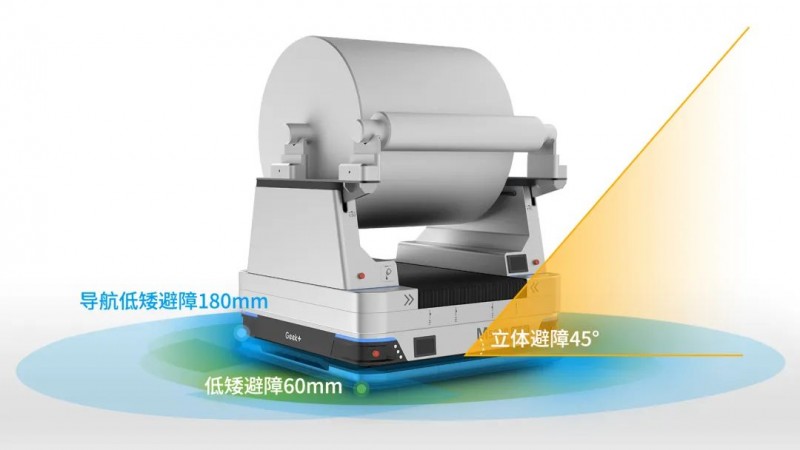 極智嘉雙舉升機器人采用激光傳感器,融合視覺算法,實現(xiàn)與機臺、緩存架的精準對接,各向?qū)泳瓤蛇_±0.5mm。搭配使用光電傳感器,可識別出料軸在叉臂上發(fā)生的位置偏移,并調(diào)整動作自動糾偏,有效防止拖料、掉料,降低安全風險和生產(chǎn)損失。