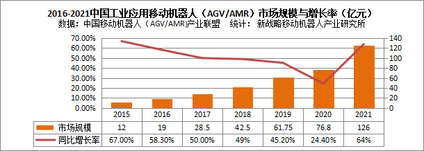 圖表:2015-2021中國工業(yè)應(yīng)用移動(dòng)機(jī)器人(AGV/AMR)市場(chǎng)規(guī)模(億元)與增長率